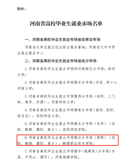 近日,河南省高校毕业生就业市场名单正式公示,我校凭借深厚的办学底蕴、持续优化的就业服务体系及与区域产业协同发展的积极探索成效,成功获批“河南省高校毕业生就业市场豫北分市场(高职)”,系全省唯一一个获批区域就业分市场的专科院校。